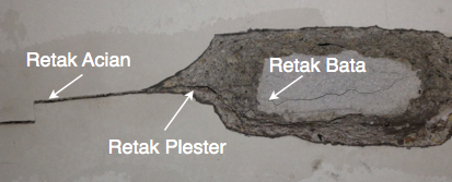 Penyebab: Celah pemasangan  pipa listrik atau air yang tidak dipotong sampai bata, celah hanya dibuat sampai plaster atau pipa hanya diletakkan diatas bata kemudian diplaster kembali.