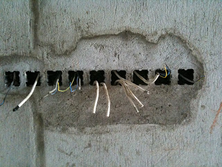 3. Saluran listrik, pipa air, pipa AC dan kotak saklar harus dipasang masuk ke dalam bata kemudian ditutup menggunakan material plester sama yang akan digunakan, hal ini dilakukan minimal 3 hari sebelum aplikasi plester. Tahapan seperti ini dapat mencegah retak plester dari susut karena pergerakan pipa.
