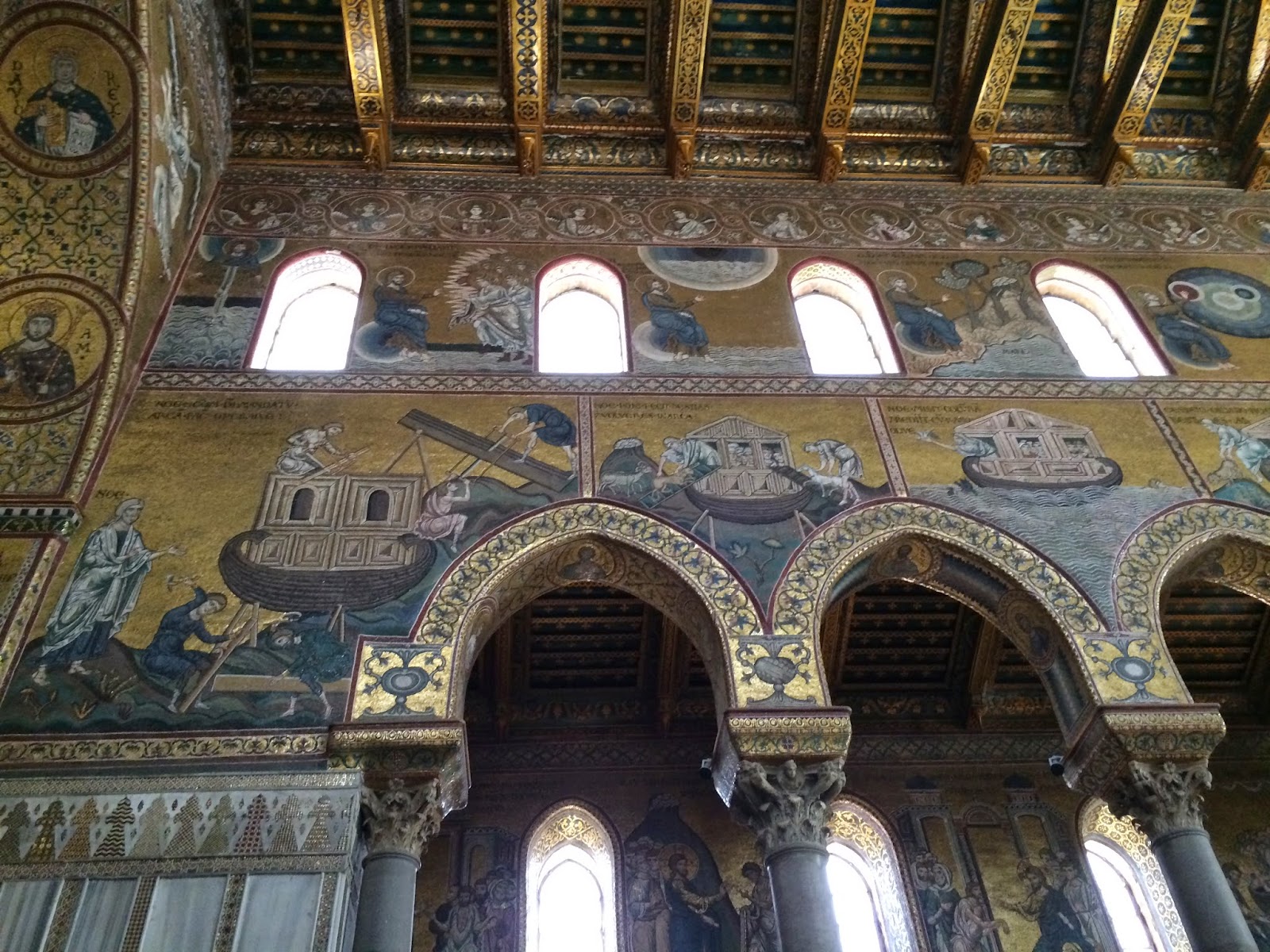 Greek corinthian columns, Roman arches, Saracen ceramic and glass tiling.