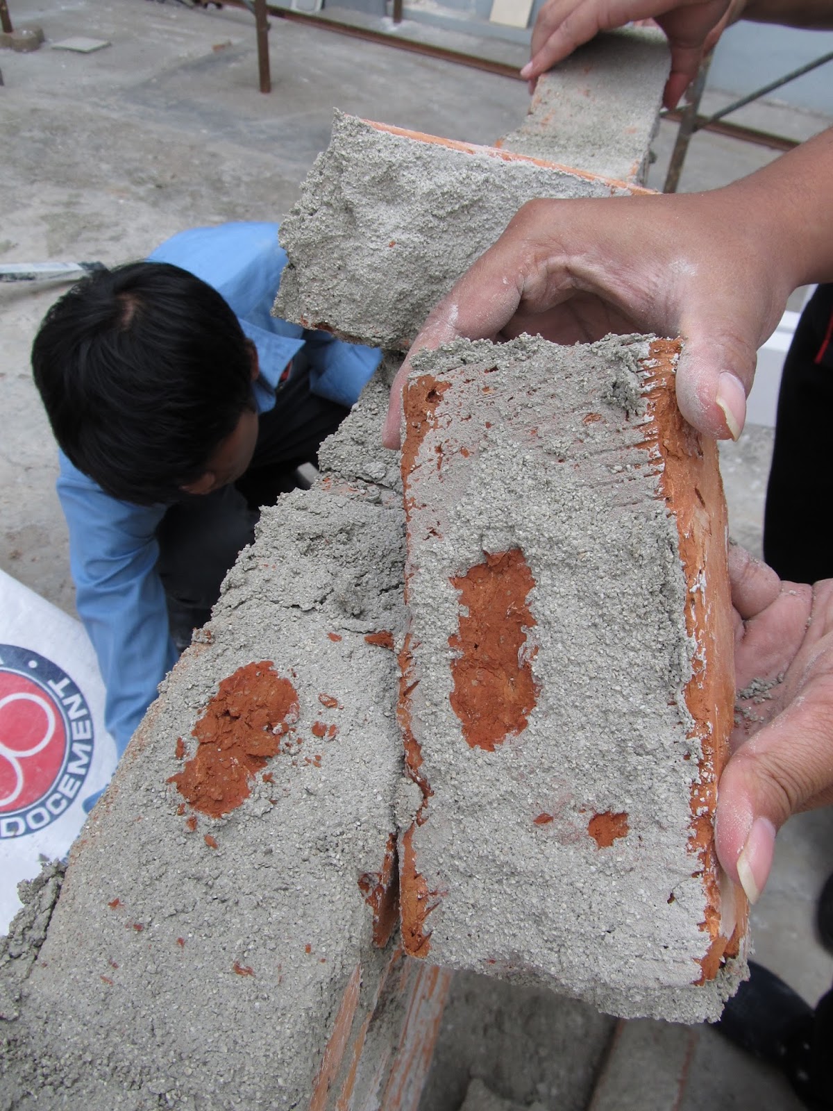 Pasangan bata menggunakan mortar (photo kanan) ikatan sangat kuat, adukan menempel baik pada bata. Pada photo terlihat bagian bata yang pecah terangkat.