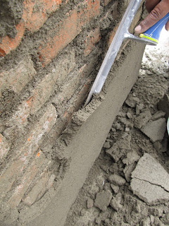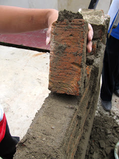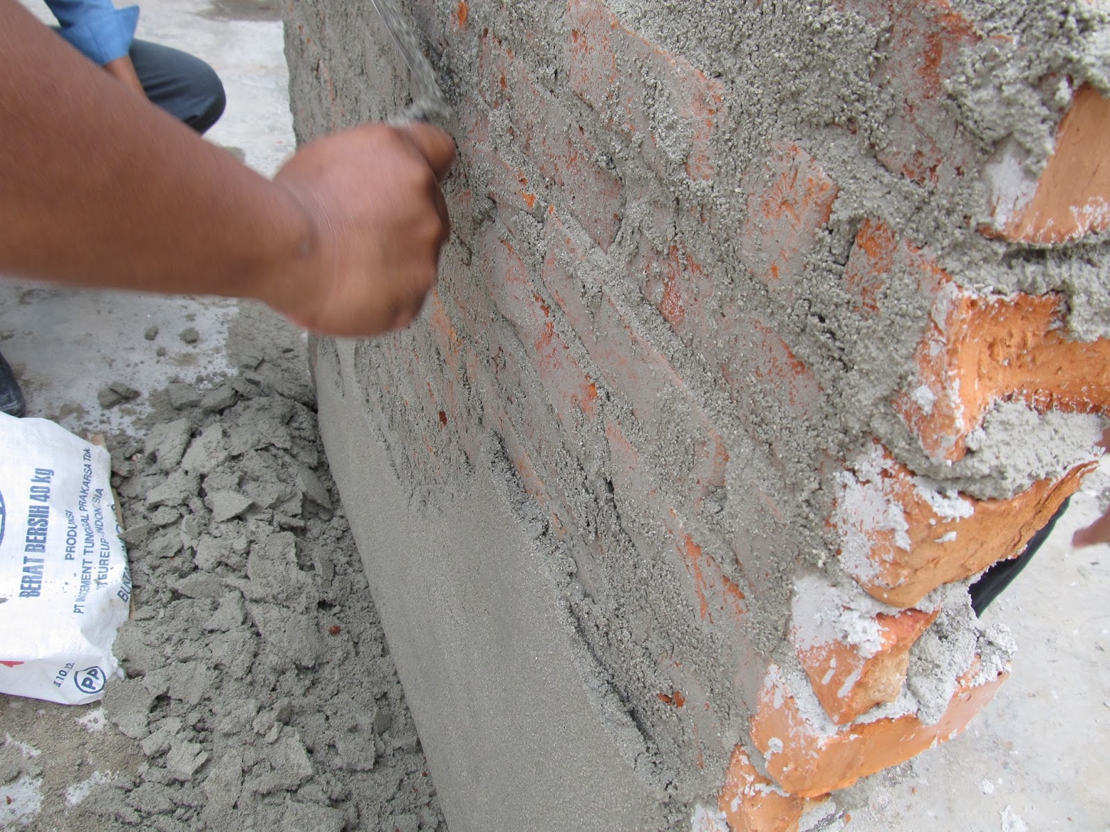Pasangan bata dengan pengadukan pasir – semen langsung di tempat (photo kiri) penyerapan air yang tinggi membuat ikatan menjadi lemah.