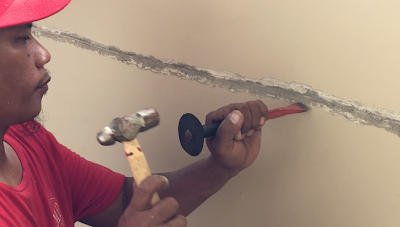 Retak yang lebih besar dari retak rambut, celah retakannya harus dibuka terlebih dahulu uk lebarnya 2mm-3mm dengan kedalaman 3mm. Buat adukan TR-30 dengan Bonding Agent lebih kental dari adukan diatas, lebih kental dari adukan cat. kuas terlebih dahulu celah retakan menggunakan larutan Bonding agent 1:1 dengan air, setelah itu masukkan campuran diatas kedalam celah, setelah 1 hari acian bisa diamplas sampai halus dengan uk 300 sebelum dicat kembali.
