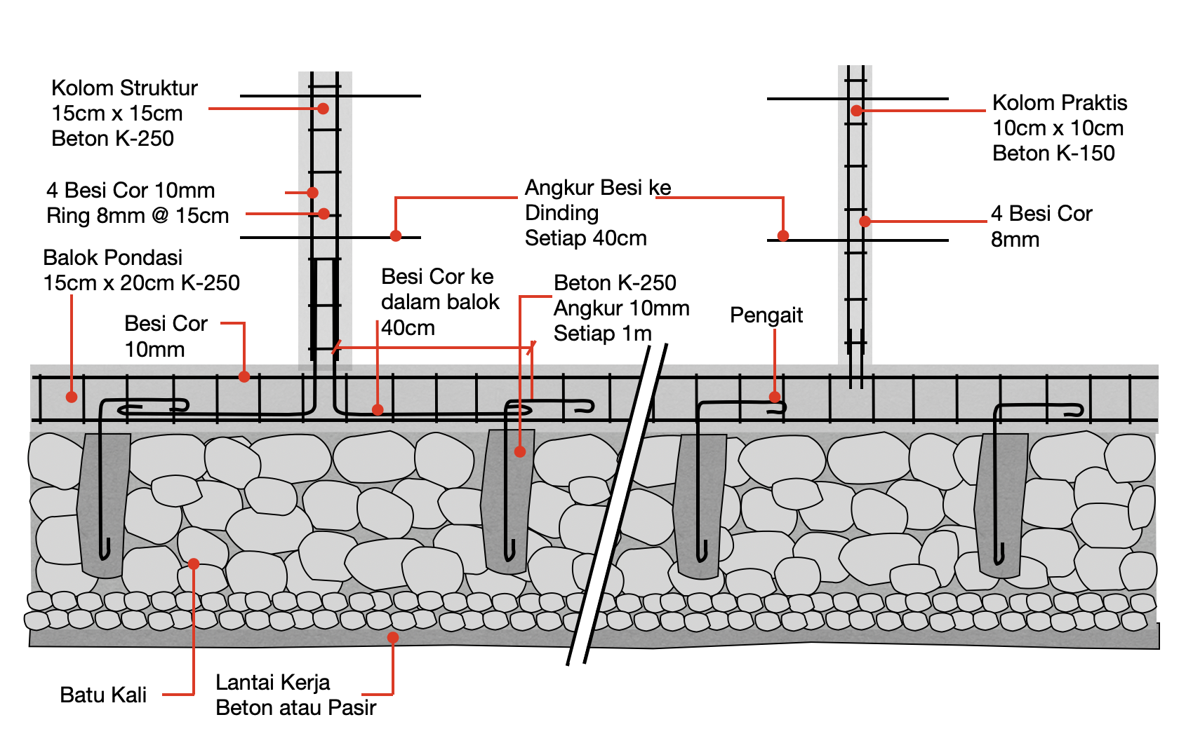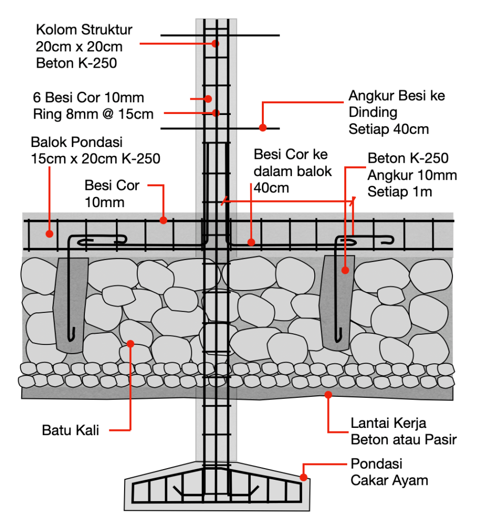 Balok pondasi harus beton bertulang baja 20cm x 15cm.
