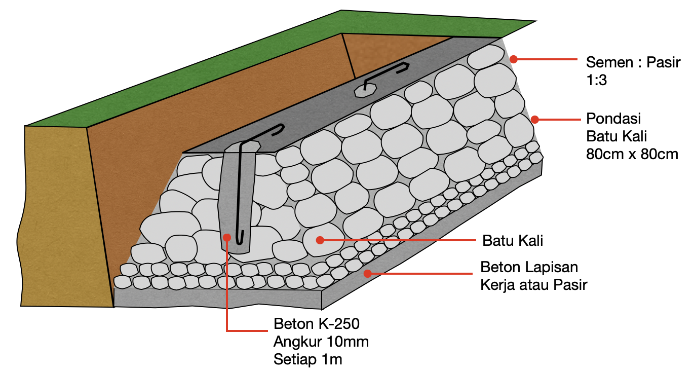 Pondasi yang menggunakan batu kali harus direkatkan menggunakan pasir dan semen 3:1 dengan kadar air rendah. Pondasi harus berukuran 80cm x 80cm.Pondasi Batu kali harus dipasang pada balok setiap 1m dengan tulangan baja dan beton 10mm.