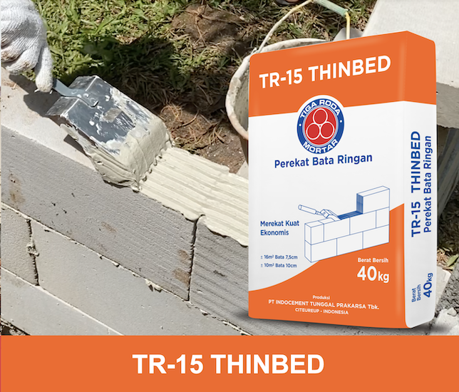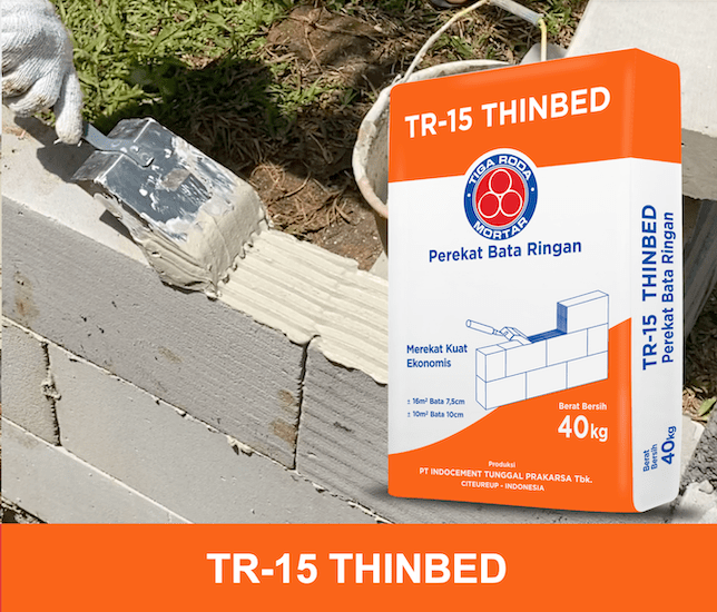 TR-15 Thinbed atau Perekat Bata Ringan adalah campuran Semen Tiga Roda, Pasir Limestone halus <0.6mm dan aditif kimia khusus.