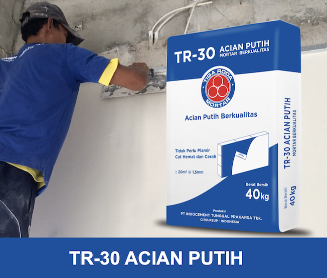 Produk mortar terbaru dari Indocement untuk melengkapi mortar TR-30 Acian Putih yang sebelumnya telah sukses dipasaran, dalam hal aplikasi dinding. Sekarang kontraktor lebih yakin lagi dengan mortar berkualitas tinggi dari Tiga Roda untuk aplikasi dinding Bata Merah, Bata Ringan, Sistem Panel dan Blok Beton.