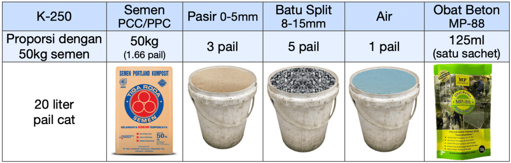 Untuk kekuatan yang lebih tinggi, kurangi proporsi pasir ke 2.5 pail dan kurangi airnya sedikit.(2 Liter)