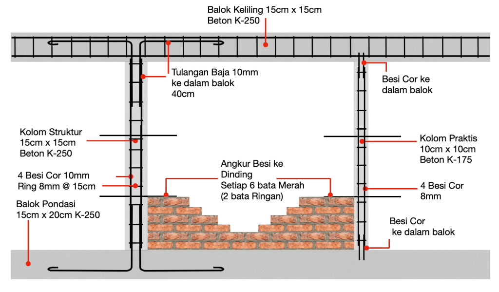 Pasangan bata sebaiknya diikat/ diangkur ke kolom structural atau kolom praktis setiap 600 mm menggunakan besi sesuai dengan regulasi gempa pemasangan bata.