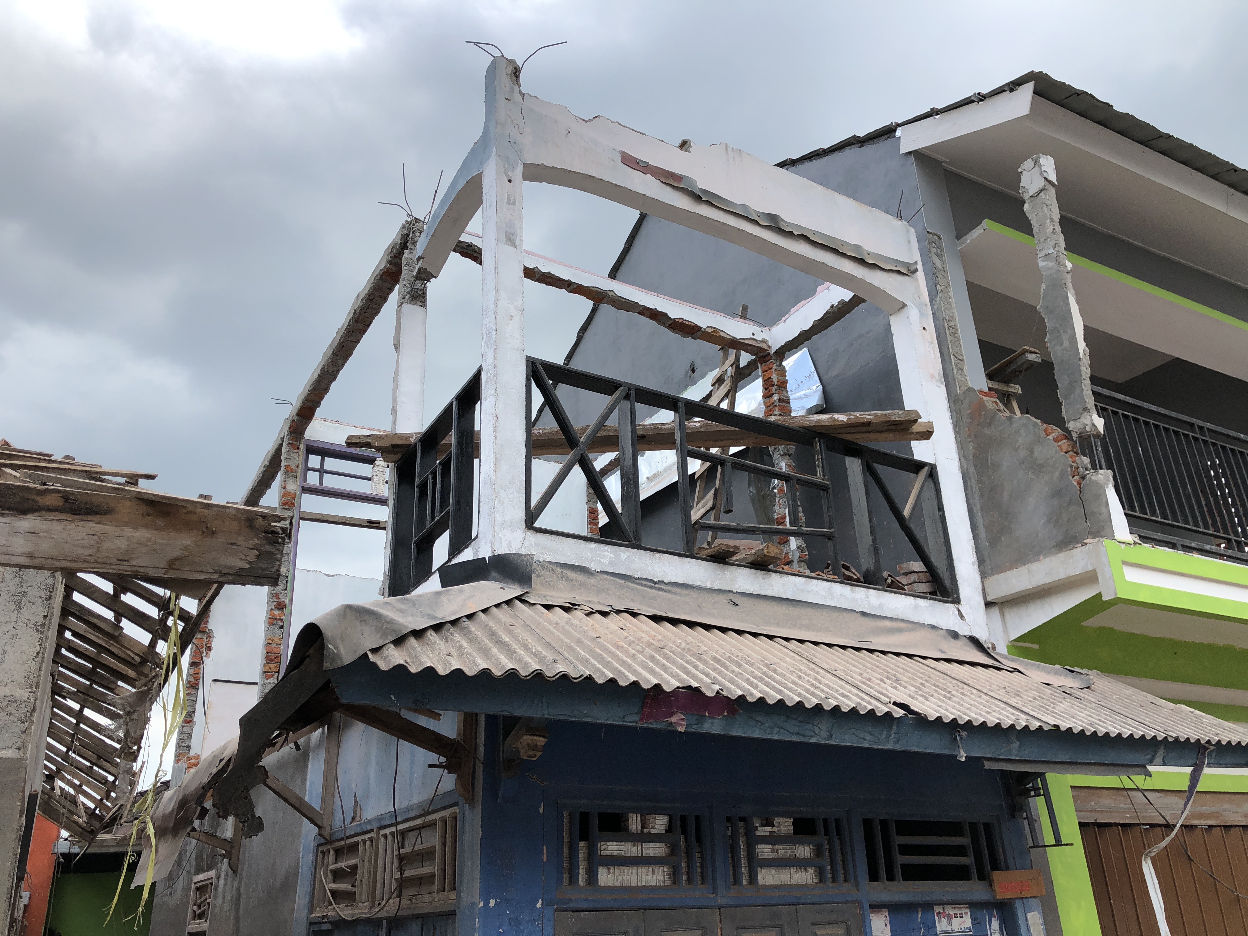Struktur rumah yang kuat ini tidak dapat menghentikan kerusakan bangunannya akibat liquifikasi tanah, Tetapi dapat membantu menyelamatkan nyawa orangyang ada di dalamnya. Ini foto dari bencana Cianjur tahun 2022.