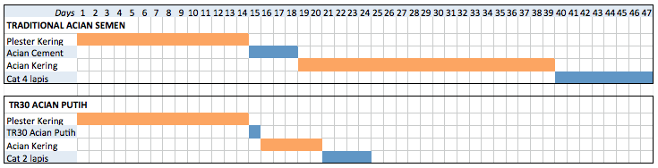 A: TR 30 Merupakan produk khusus untuk acian dinding yang mempunyai material halus,yang dirancang untuk lebih fleksibel, jadi tidak cocok/efektif untuk digunakan untuk acian lantai.Produk ini bisa digunakan untuk acian lantai apabila ditambahkan lagi semen dan pasir untuk menambah kekuatannya